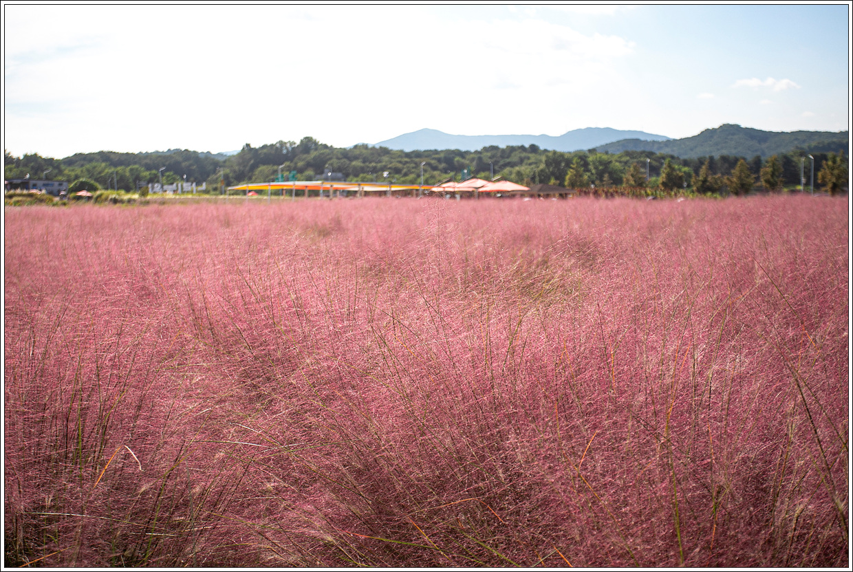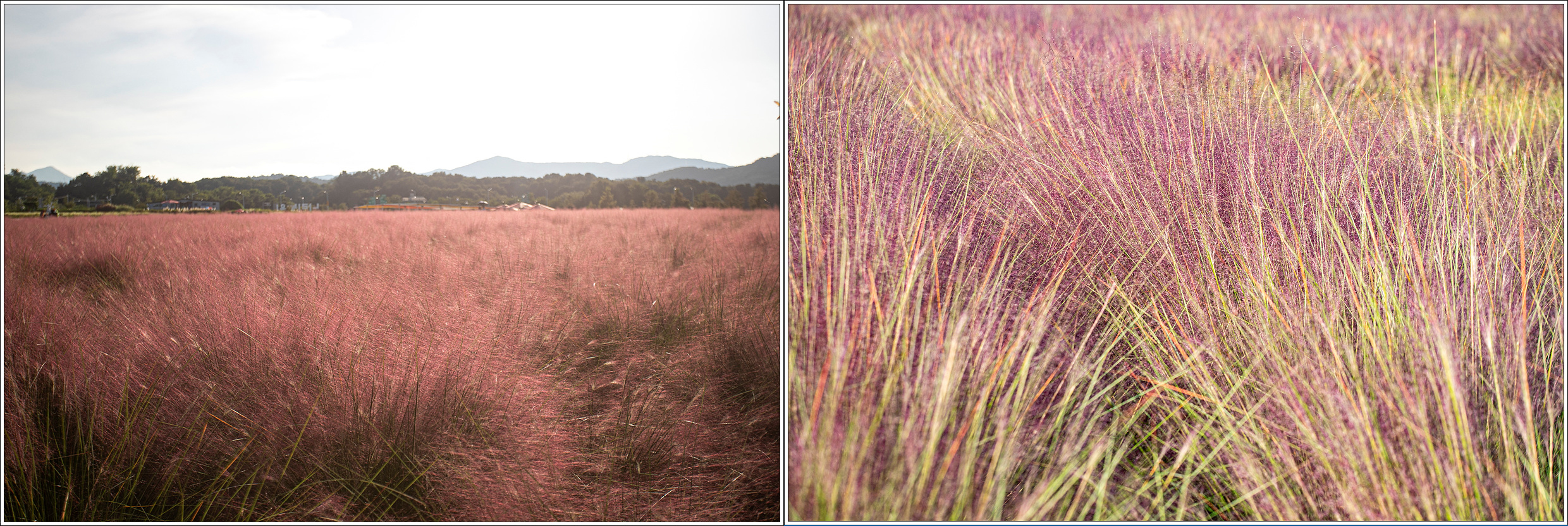 ▽ 핑크뮬리는 지금이 절정이다. 핑크뮬리의 학명은 ‘Muhlenbergia Capillaris’다. ‘Capillaris’는 ‘머리카락 같은, 머리털의’라는 뜻의 라틴어 ‘Căpilláris’에서 유래했다. 가을철 바람에 흩날리는 풍성한 분홍색 꽃이 아름답다. 그러나 환경부 에서는 핑크뮬리를 2급 유해종으로 지정했는데 아열대에서 번식력이 강한 이 식물이 지구의 온난화로 우리나라에서도 기존 생태계를 교란할 수 있기 때문이란다.