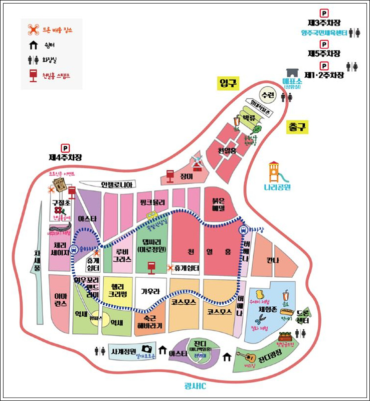 ▽ 버스정류장은 나리공원으로 되어 있지만 이 축제장소는 나리농원이다. 나리농원과 나리공원, 나리골프장은 휀스로 울타리를 설치해 놓아 경계를 이룬다.