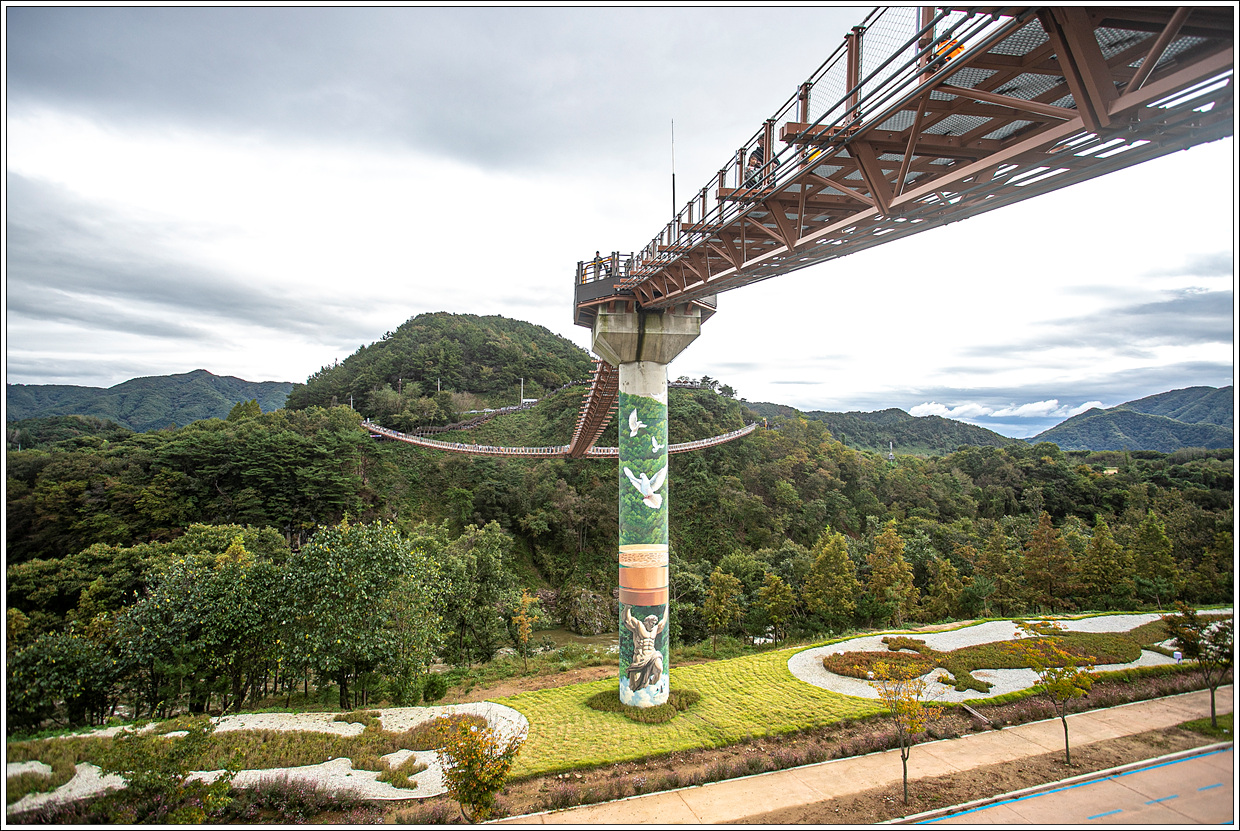 ▽ 출렁다리 상판을 떠 받치고 있는 듯한 신화에서나 보는 듯한 그림 한폭이 그려진 교각도 콘크리트의 삭막함을 비둘기와 함께 자연과 조화를 이뤄 부드러움으로 잘 표현해 낸 아이디어가 돋보인다.