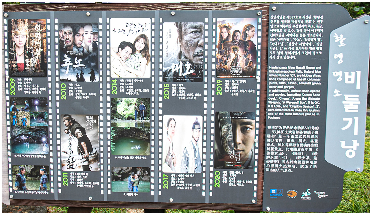 ▽ 천연기념물 제537호로 지정된 '한탄강 현무암 협곡과 비둘기낭 폭포'는 현무암으로 이루어진 주상절리의 폭포, 동굴, 에메랄드 빛 호수, 협곡 등이 어우러져 신비로움을 자아내는 숨은 명소이다. 최근 선덕여왕, 추노, 최종병기 활, 늑대소년, 괜찮아 사랑이야, 킹덤시즌1 ,2 등 각종 드라마와 영화 촬영지로 널리 알려지면서 포천의 명소로 자리잡고 있다고 안내문은 전한다.