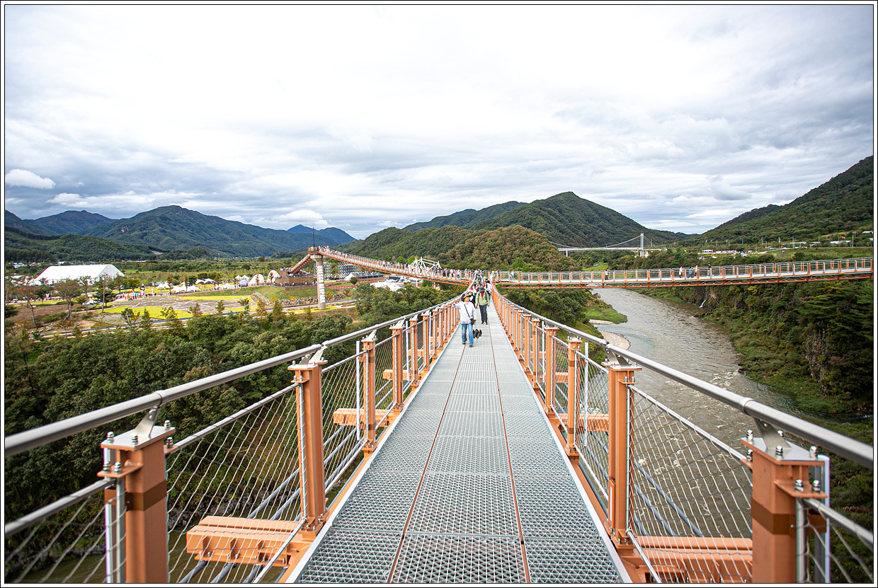 ▽ 출렁다리 바닥은 철판망으로 되어 있어 아래를 대략 볼 수 있는 구조여서 더욱 스릴을 느낄 수 있도록 건설됐다. 다리 위를 걷는 인원수에 따라 이동하면서 좌우로 출렁이는 움직임이 다르므로 고소공포증을 느끼는 분들은 발걸음이 더딜 수밖에 없다.