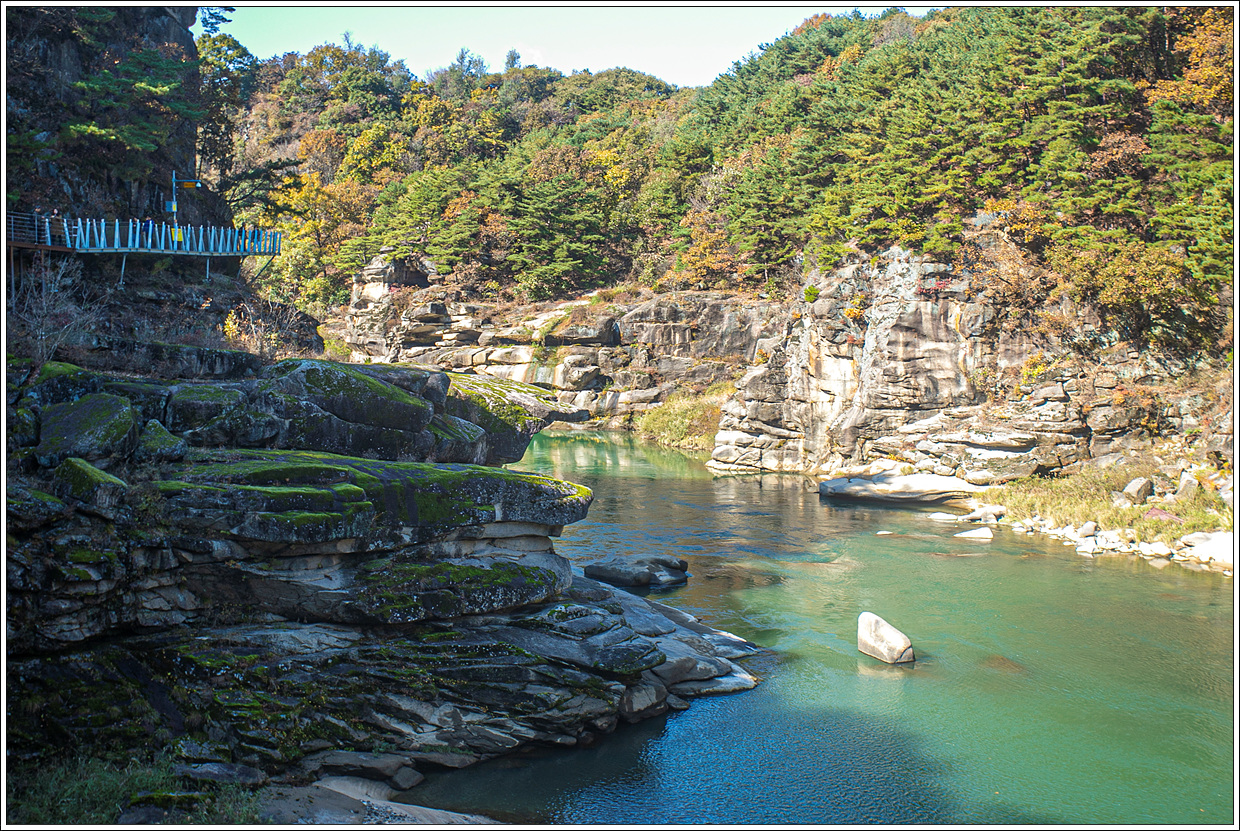 ▽ 첫 번째 쉼터인 맷돌랑쉼터를 지나게 되면 이와 같이 탁 트인 강줄기가 보이면서 주상절리 형태를 띤 계곡을 만날 수 있다.