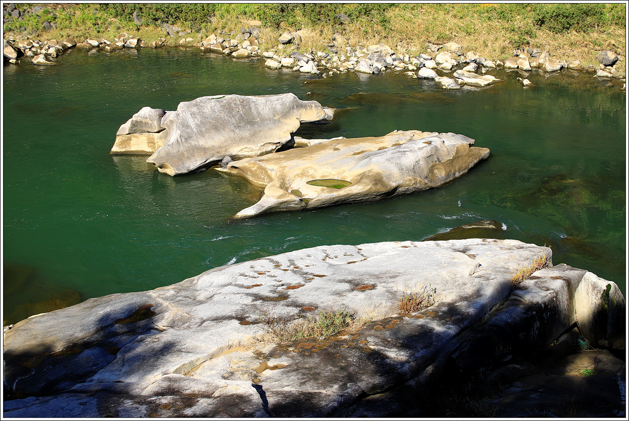 ▽ 돌개구멍교를 지나는데 저 아래에 돌에 홈이 패인 것이 보인다. 자갈이 물과 함께 회전하며 바위를 갈아내 자연적으로 만들어져 돌개구멍 같이 생겨서 붙여진 이름인 모양이다.