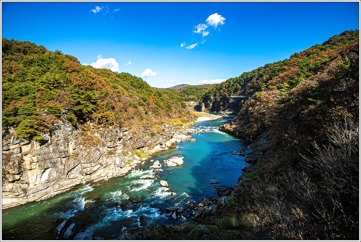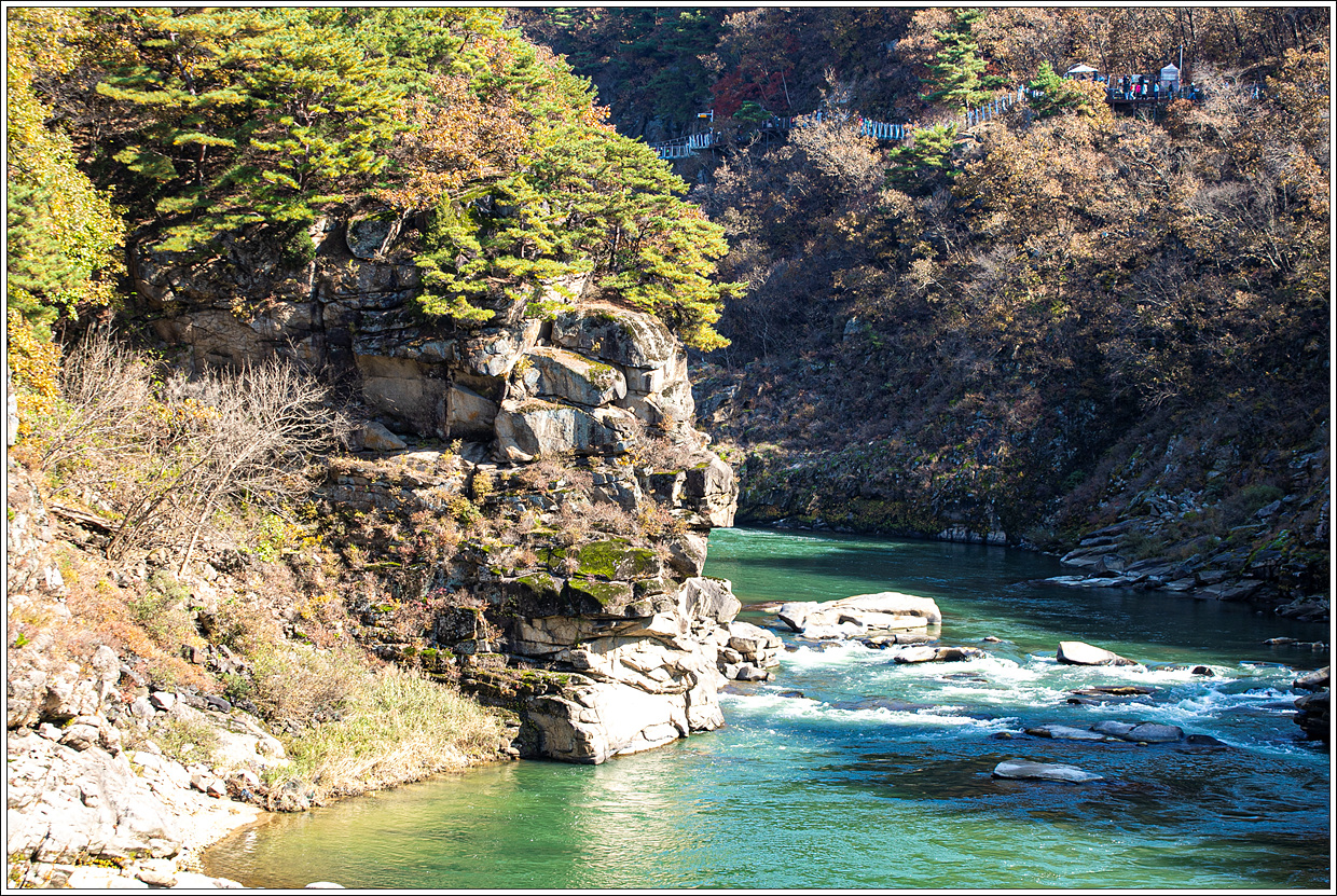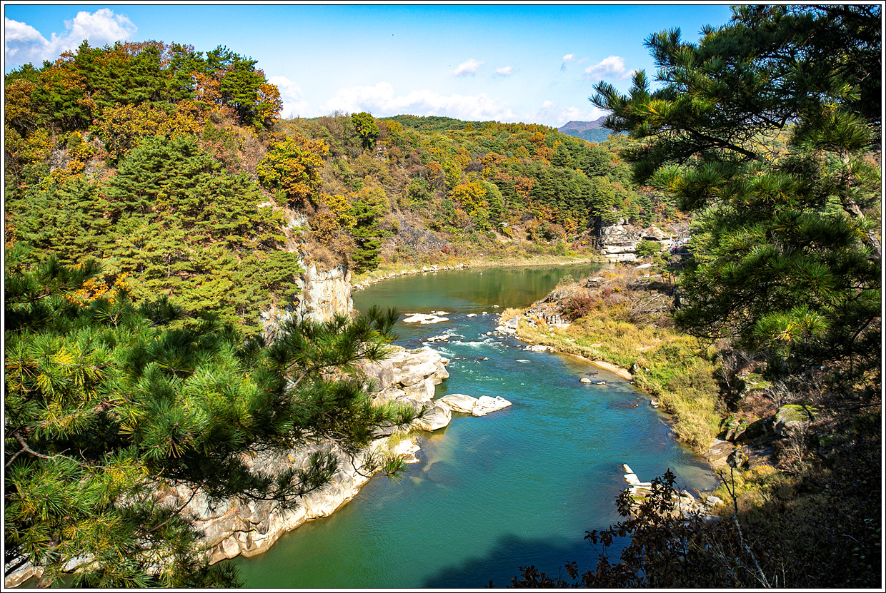▽ 순담계곡전망쉼터에서 바라 본 풍경으로 이곳이 고석정 쪽에서 래프팅이 시작되어 이곳이 도착지점인 것 같다. 6년 전 얼음트레킹도 고석정 방향을 이곳부터 출발했는데 지금도 변함 없는지 모르겠다.