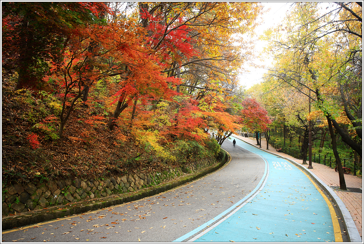 ▽ 연무초등학교 울타리의 샛노란 은행나무와 도로색이 조화를 이루면서 아름답게 느껴지는 길을 걷노라면 어느새 동장대(東將臺)에 가깝게 이른다.