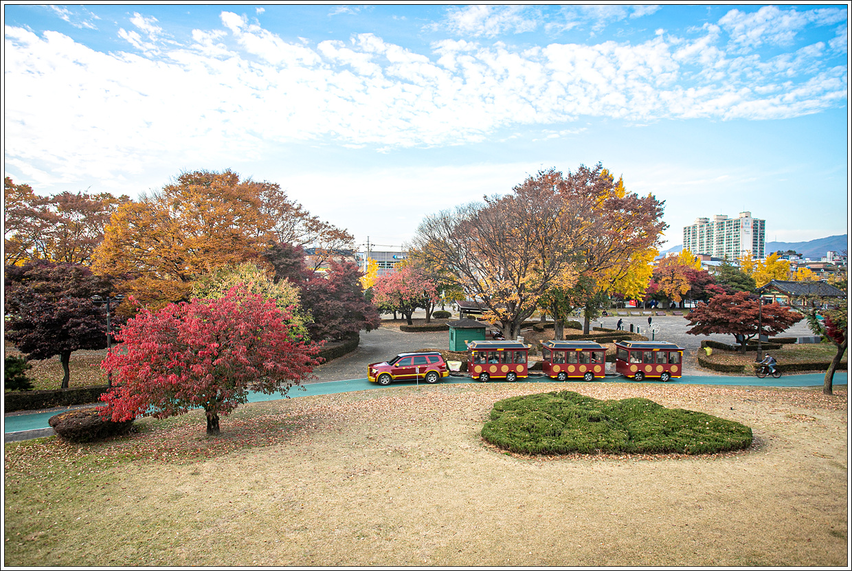 ▽ 성 외곽은 장안공원인데 왠 꼬마 열차가 지나간다. 알고보니 수원화성어차로 성곽길 순환열차이다. 온라인으로 예매하고 현지에서도 예매할 수 있으나 성수기에는 매진이어서 타기 어렵단다.