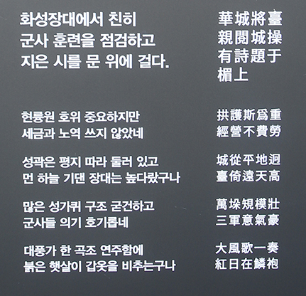 1795년 성조가 끝난 뒤 정조는 화성장대 현판의 글씨를 직접 쓰고 만족스럽고 기쁜 마음을 시로 표현했다. 화성에서 유일하게 정조가 지은 두 개의 현판이 걸려 있다.