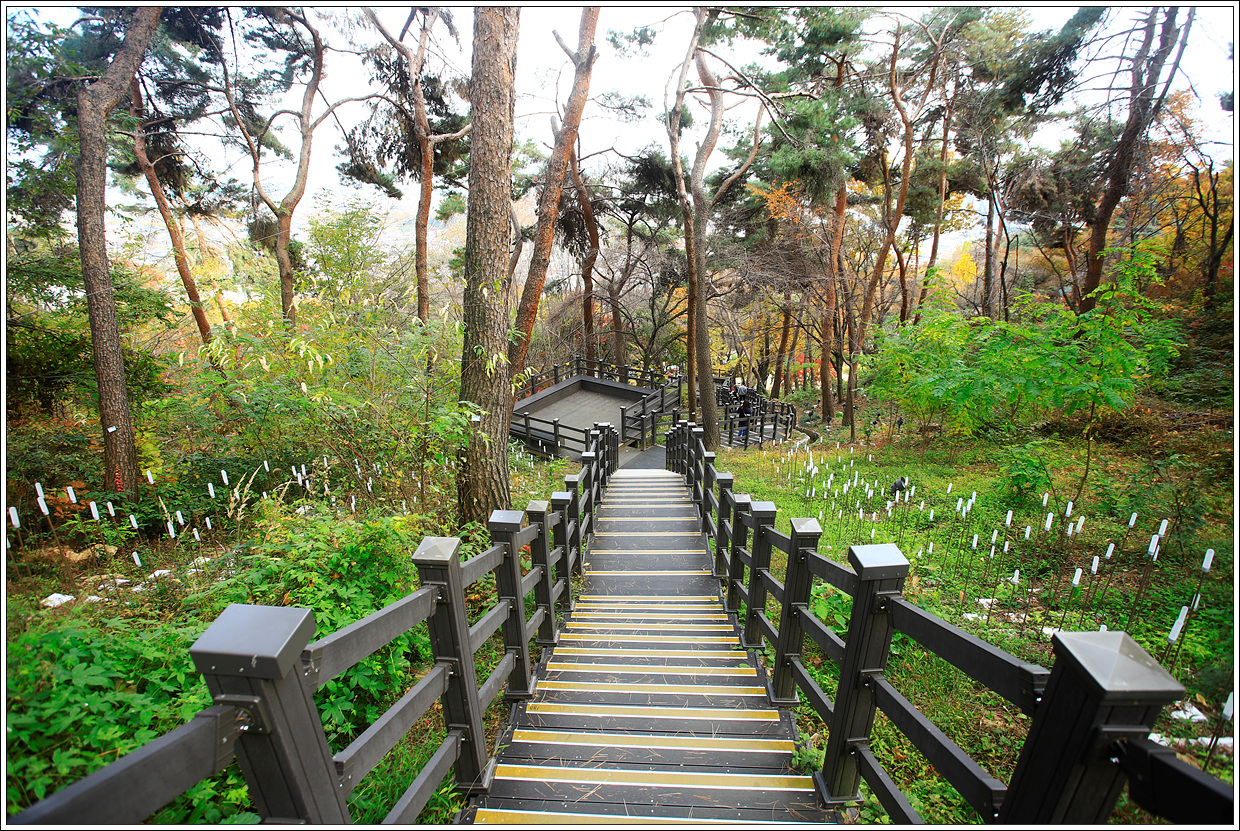 ▽ 서장대에서 북쪽으로 곧장 내려가면 서포루(西砲樓)를 경유하게 되지만 30m 뒤돌아 동쪽 데크계단으로 내려가 화성행궁(華城行宮)을 둘러보기로 한다.