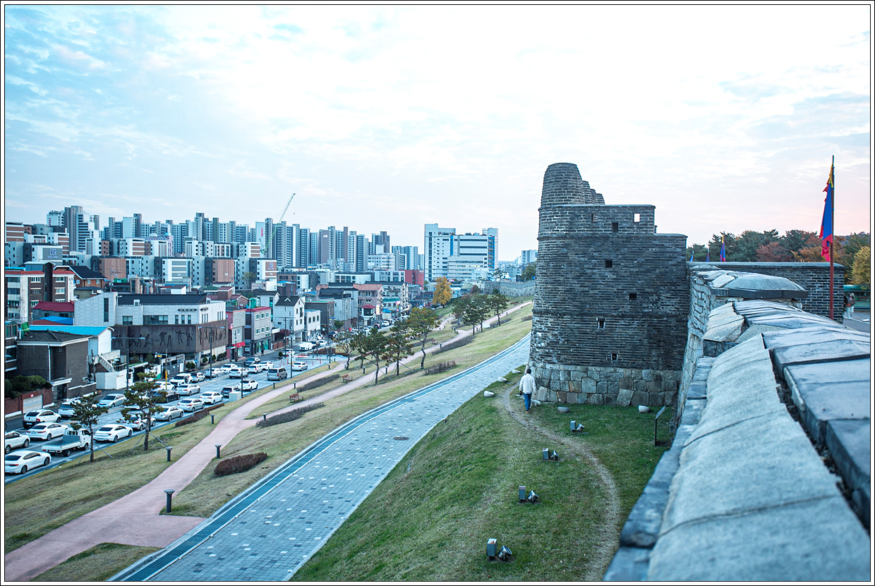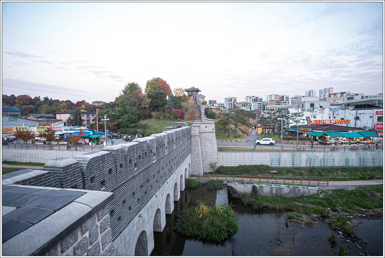 ▽ 왼쪽 끝 창룡문에서 오른쪽 동남각루(東南角樓)까지 이어지는 성곽이 한눈에 들어온다.