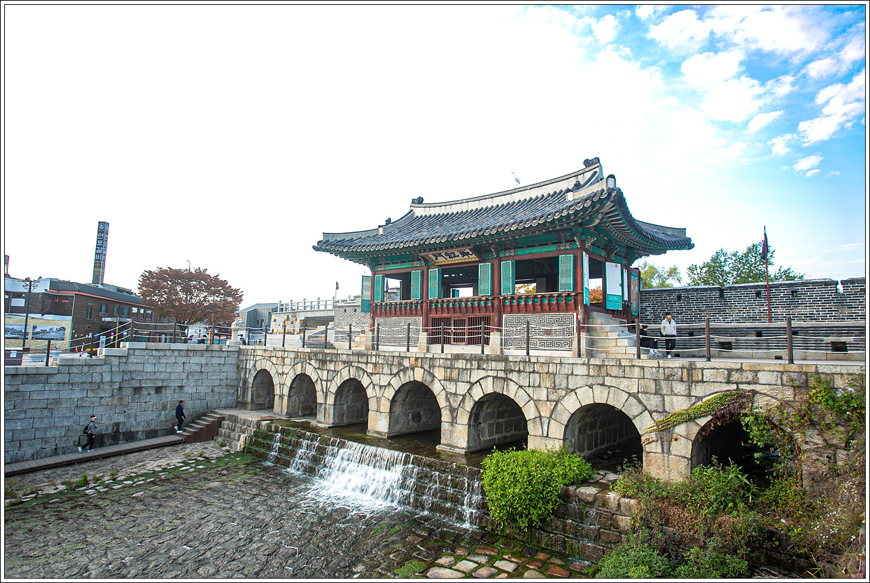 ▽ 이어서 북수문(화홍문)과 동북각루가 보인다.