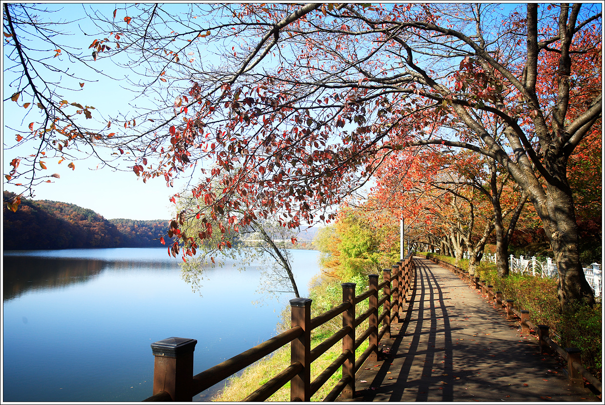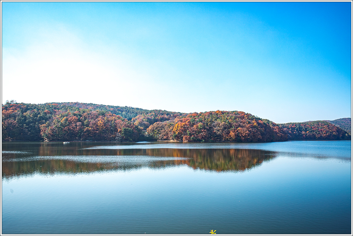 ▽ 단풍을 즐기다 보니 어느새 저수지 제방 가까이 왔다. 오르락 내리락 수없이 반복되는 길이지만 가볍게 한 바퀴 돈 것 같다.