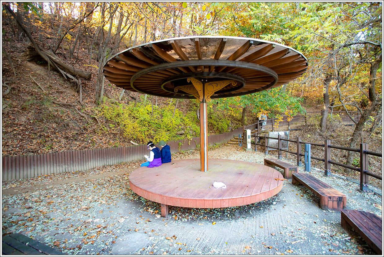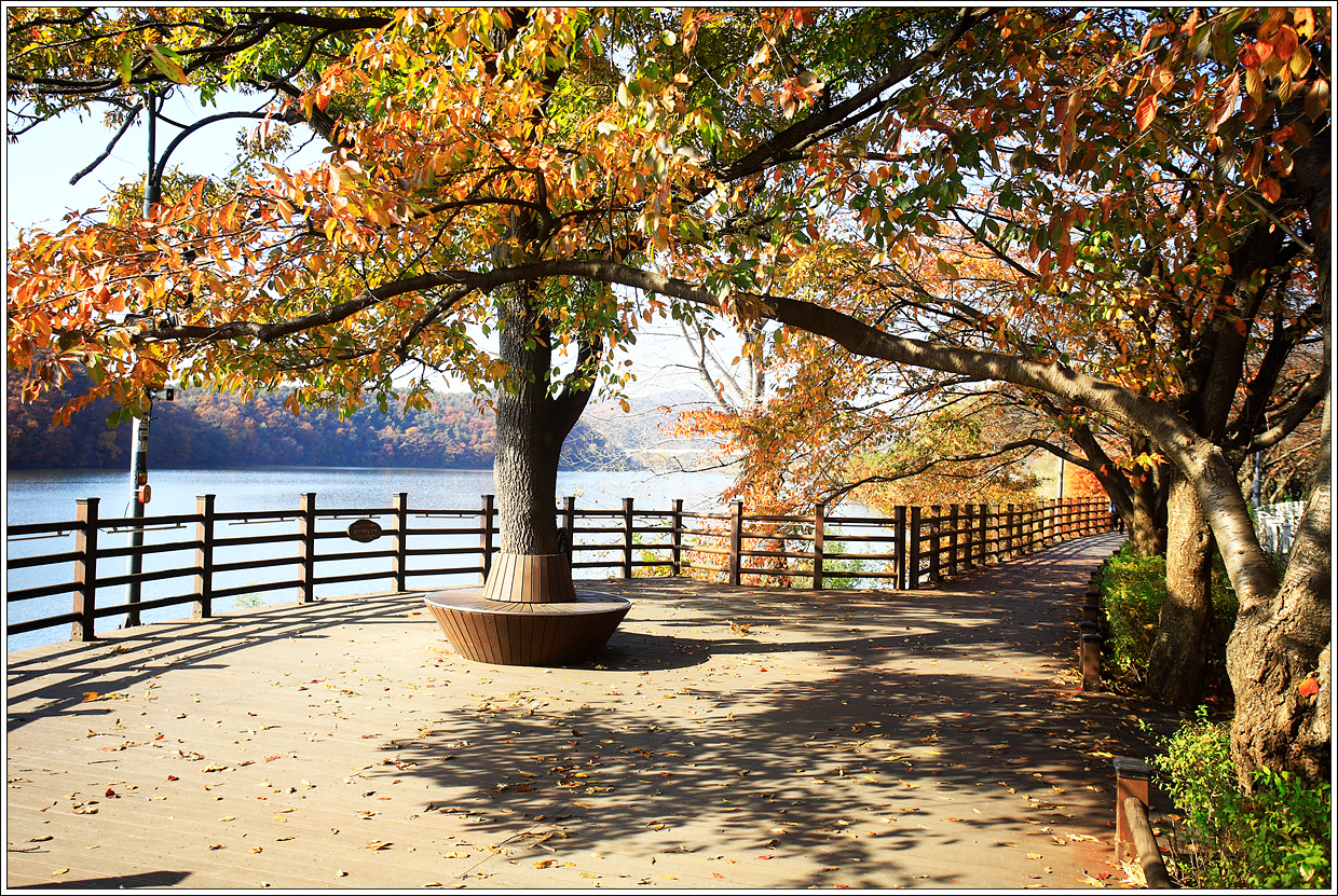 ▽ 저수지 끝 부분 반화점 부근에 화장실도 있고 운동기구들이 설치되어 있는 쉼터의 단풍이 곱게 물들었다.
