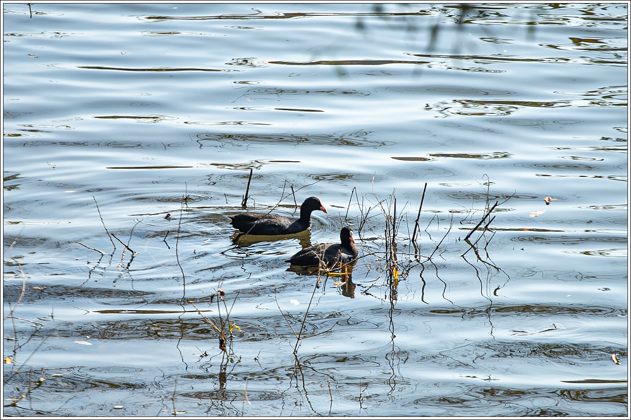 ▽ 물닭 한쌍이 가까이서 보란 듯 먹이 활동을 하고 있어 저수지의 터줏대감 노릇을 하는 듯 하다.
