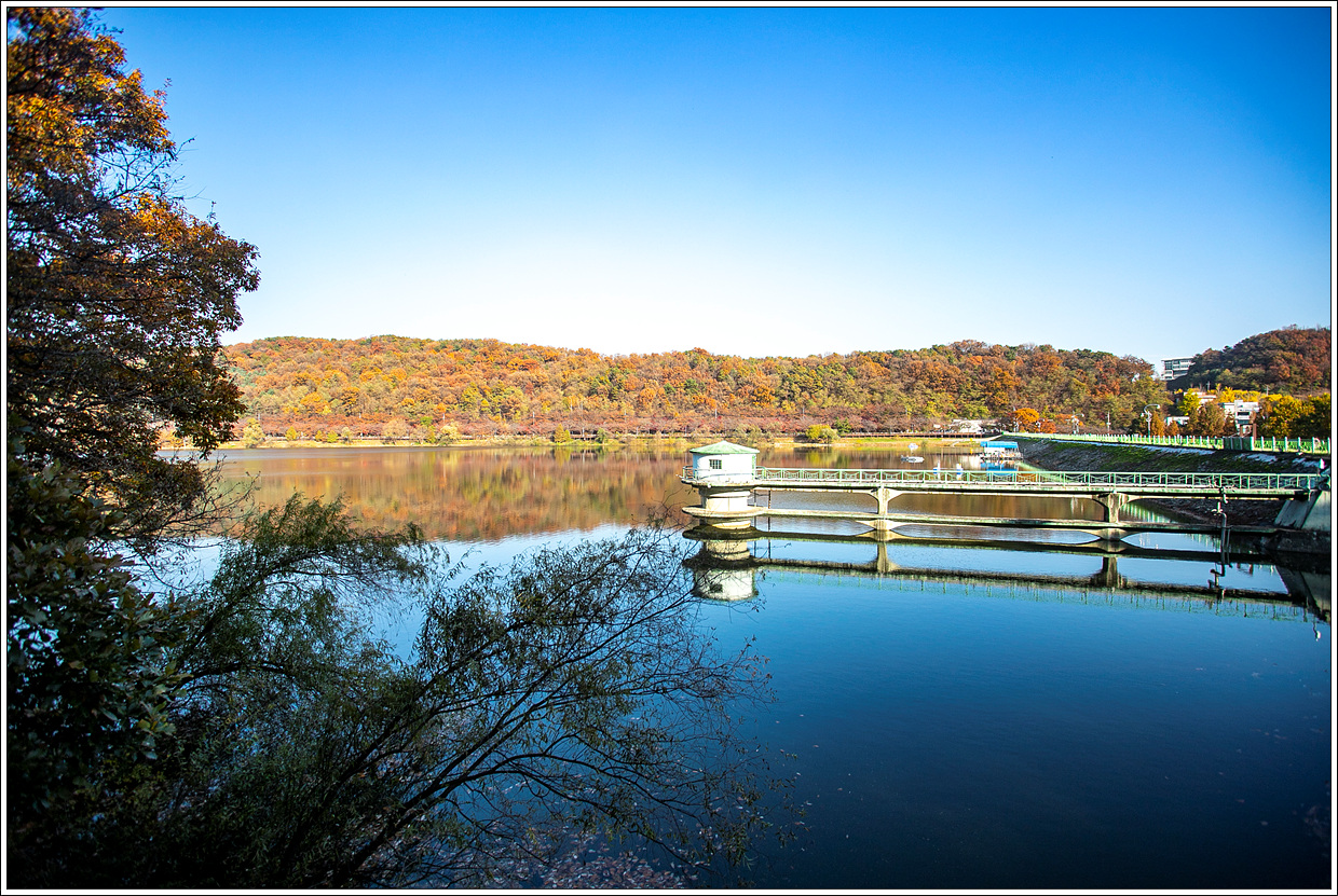 ▽ 다시 저수지 제방 위에 올라 섰다. 수원시 상수도원으로 수질관리를 잘 하고 있는 것 같다.