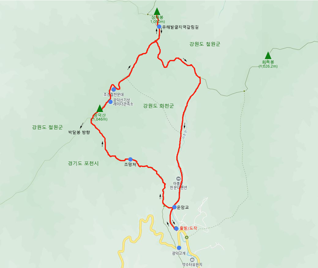♣ 코스: 운암교-광덕산-기상레이더관측소-화천조경철천문대-상해봉-운암교 (원점회귀)