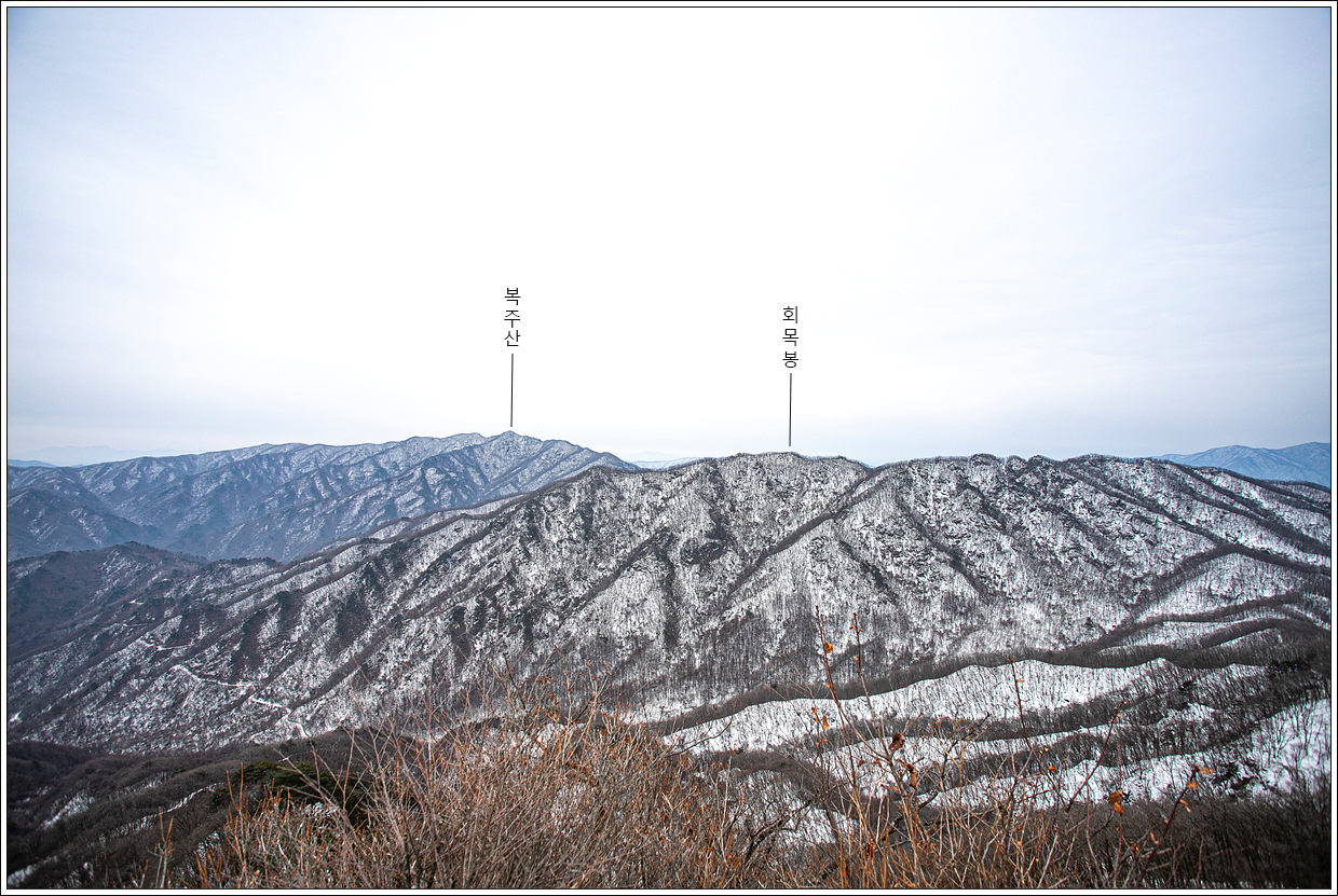 ▽ 앞쪽 회목봉과 그 뒤로 복주산으로 이곳 상해봉과 광덕산을 거쳐 백운산 방향으로 이어지는 한북정맥의 일부구간이다.