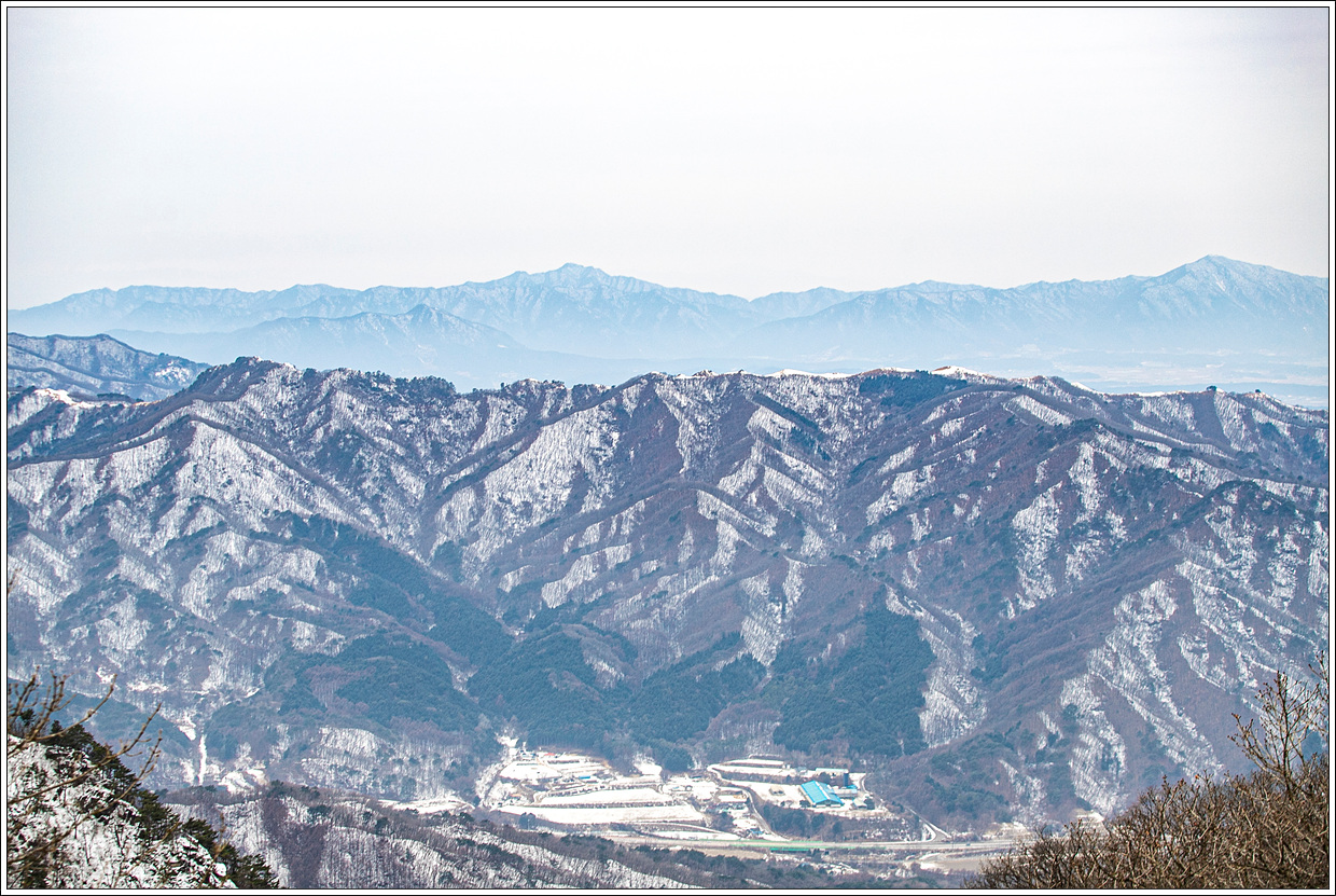 ▽ 앞쪽 각흘산의 능선과 왼쪽 멀리 보개산 지장봉과 오른쪽 금학산의 능선이 좌우로 뻗어 있다.
