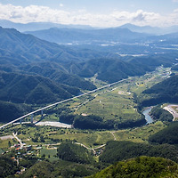 ▽ 북서방향의 대득지맥 라인이 한눈에 들어온다. 각흘산으로 부터 태화산~악희봉~ 564.2봉~대득봉~태봉을 경유, 철원군 갈말읍 토성리의 한탄강과 김화남대천의 합수점까지의 도상거리 33.5km이다. 47번 국도가 긴 계곡과 함께 뻗어 있고 김화읍인 와수리로 이어진 풍경이다.