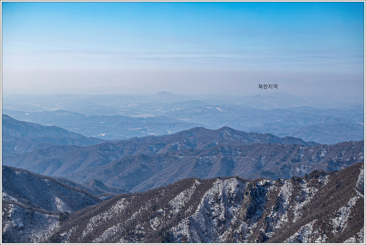 ▽ 서쪽방향으로 오늘 가야할 고대산이 바로 앞으로 보이고 멀리 북한지역은 깨스층에 가려졌다.
