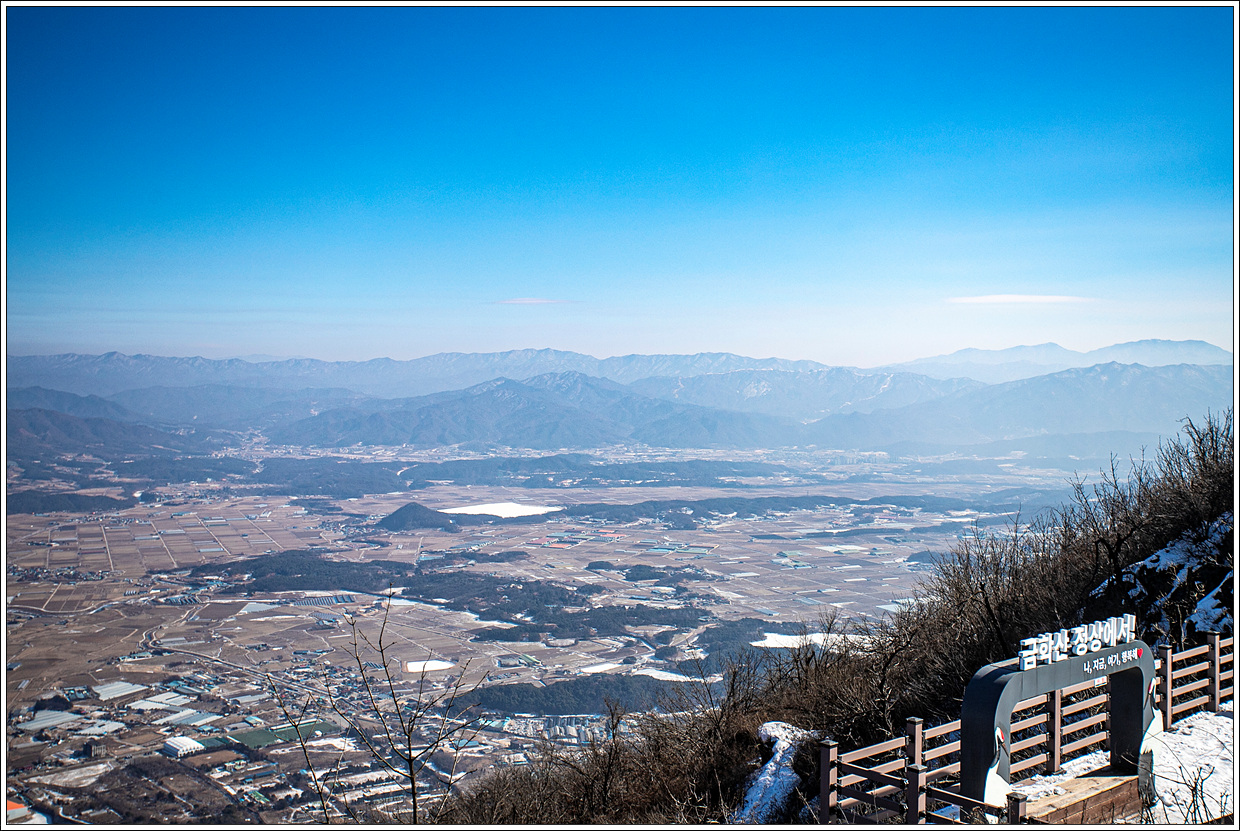 ▽ 철원의 동송읍과 평야지대가 한 눈에 내려다 보인다. 아쉽게도 맑은 날씨이긴 하나 먼 거리는 깨스층이 두터워서 시정거리가 좋지 않다. 북쪽 방향인 왼쪽에서 오른쪽으로 시계방향으로 주변을 조망해 보기로 한다.